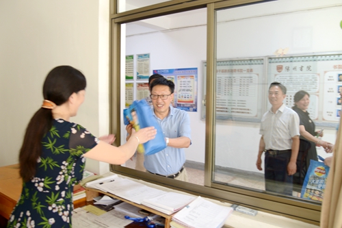汪俊昌一行先后走访了招生办、更名办、河西3幢公寓门卫室、河西一楼餐厅、医务室、河西南大门门卫室、南山大门门卫室、南山2幢公寓门卫室,亲切慰问暑假期间依然坚守岗位的教职员工。每到一处,汪俊昌都与在岗教职员工一一握手并亲切交流,了解教职工们的工作情况,向他们表示亲切的慰问,并送上防暑用品。