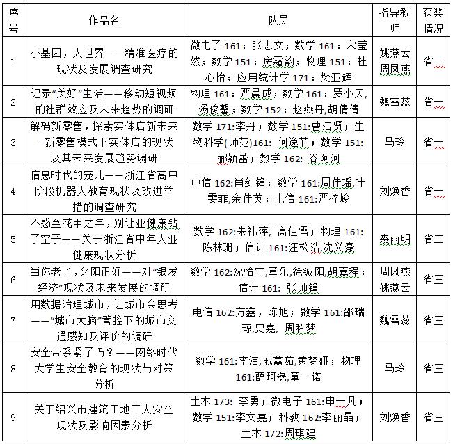 我校自2012年参加该赛事以来,获奖率均超过80%,今年获奖率90%,仅低于浙江财经大学,全省排名第二。获省一等奖的数量仅低于浙江工商大学和浙江财经大学,全省排名第三。该竞赛旨在加深大学生对系统学科知识的理解,促进调查分析技能的培养,进一步训练学生的信息调查、数据处理、统计分析技能,同时达到关心社会、了解社会,提高发现问题、分析问题及解决实际问题能力的目的。该竞赛鼓励参赛学生联系实际,突出时代主题,关注民情民意,用建设性态度积极研究我国改革开放和现代化建设过程中出现的新情况、新问题,独立思考,以小见大,创新认识,开阔视野,有利于学生社会责任感的培养。