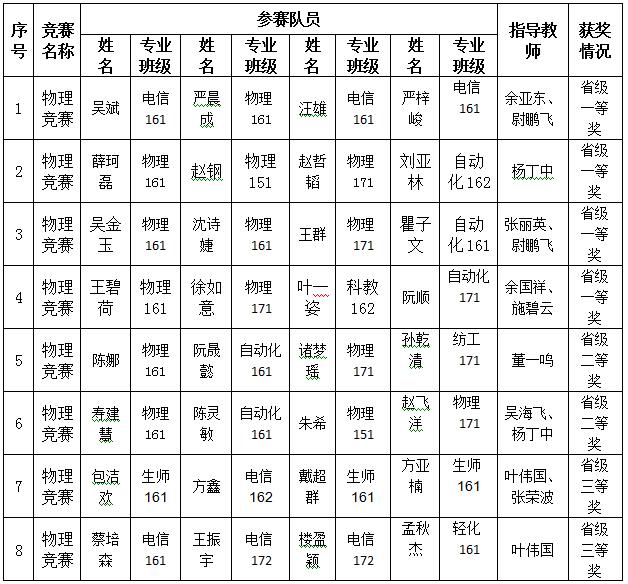 2018浙江省大学生物理科技创新竞赛获奖学生及指导教师名单