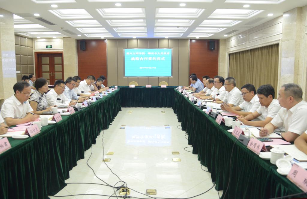 9月27日,我校与嵊州市人民政府战略合作签约仪式在铁城科教馆一楼会议室举行。嵊州市委书记徐建役,嵊州市委常委、常务副市长裘建勇,嵊州市委常委、副市长梁瑜,浙江巴贝集团董事长金耀,校党委书记汪俊昌,校党委副书记沈赤、郝敬习,副校长寿永明,校党委委员、组织部部长宣绍龙,校党委委员、宣传部部长陈均土出席签约仪式。学校相关职能部门、二级学院和嵊州市相关部门负责人参加仪式。郝敬习主持仪式。