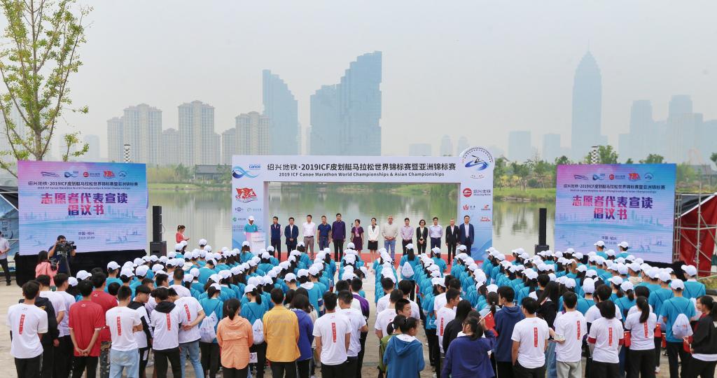 10月9日上午9点,绍兴地铁·2019 ICF皮划艇马拉松世锦赛暨亚锦赛(简称“水马”)志愿者出征仪式在越城区迪荡湖公园举行。绍兴市政府副市长顾涛、国际划联皮划艇马拉松竞赛委员会代理主席RUUD(鲁德)、我校党委副书记郝敬习及市体育局、宣传部、团市委等相关部门负责人出席仪式。