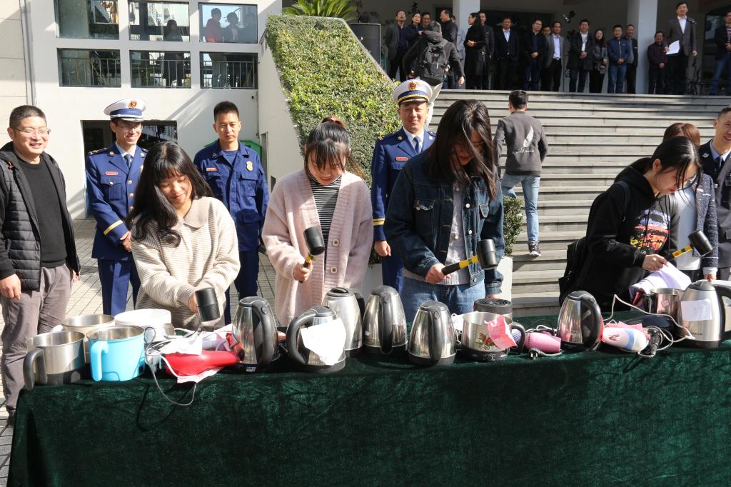 学生公寓是学生最集中的生活学习场所,是学校防火重点部位,违规使用大功率电器始终是公寓最大的安全隐患。为营造一个安全和谐的公寓环境,演习结束,还开展了学生代表宣读公寓消防安全倡议书和现场集中销毁违规大功率电器活动。