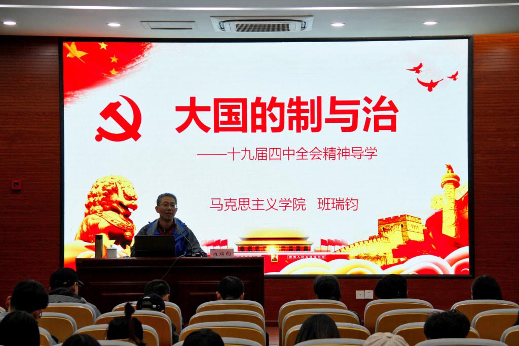 11月26日晚,原内蒙古科技大学马克思主义学院副院长、教授、硕士生导师,现我校马克思主义学院教授班瑞钧做客“时政大课堂”,作题为《大国的制与治——十九届四中全会精神导学》专题讲座。马克思主义学院、化学化工学院、机械与电气工程学院、土木工程学院、纺织服装学院、艺术学院的党员师生150余人聆听了讲座。