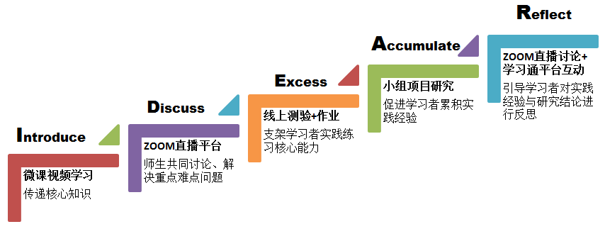 课程教学将打破原有以教师讲授为主,学习者练习为辅的模式。在教学过程中,教师与学习者同为课程参与者、学前教育研究的实践者,共同就“发现学前教育领域的现实问题—分析问题的主要思路—探究问题解决的路径—获得问题解决的方案”为课程逻辑框架,通过线上微课传递核心知识(Introduce)——ZOOM直播平台师生共同讨论重点难点问题(Discuss)——线上测验+作业支架学习者实践练习核心能力(Excess)——小组科研项目研究促进学习者累积实践经验(Accumulate)—ZOOM直播讨论+学习通平台互动引导学习者对实践经验与研究结论进行反思(Reflect),这一教学模式,支架学习者在建构教学研究能力基础上,实现未来幼儿园教师综合实践素养的提升。