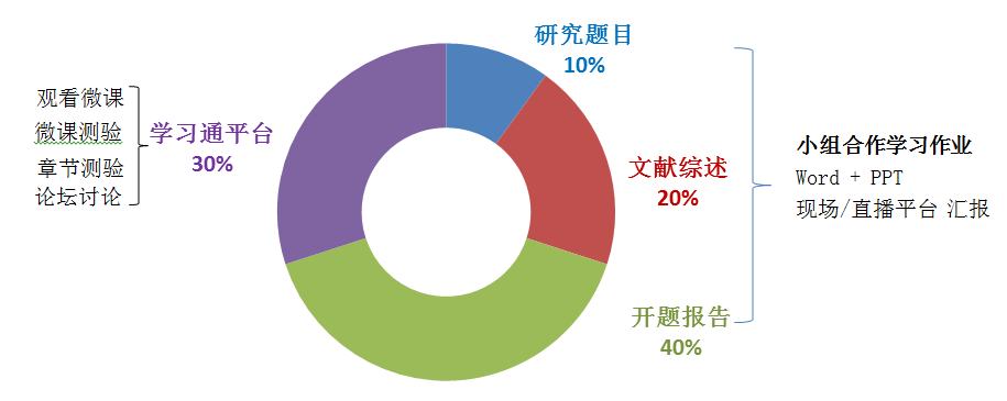 改革原有课程单一教学考评的限制,课程评价体系将涵盖:核心知识评价、核心能力评价、实践效果评价三大组成部分,结合学生课堂学习表现、小组合作学习过程与成果、线上学习的数量与质量,进行全过程、全角度的即时评价—反馈机制,通过评价让学习者判断自己学习进程,通过即时反馈支架学习者持续改进。实现评价之于学习者的支架、促进功能。具体学习评价项目及占比构成如下: