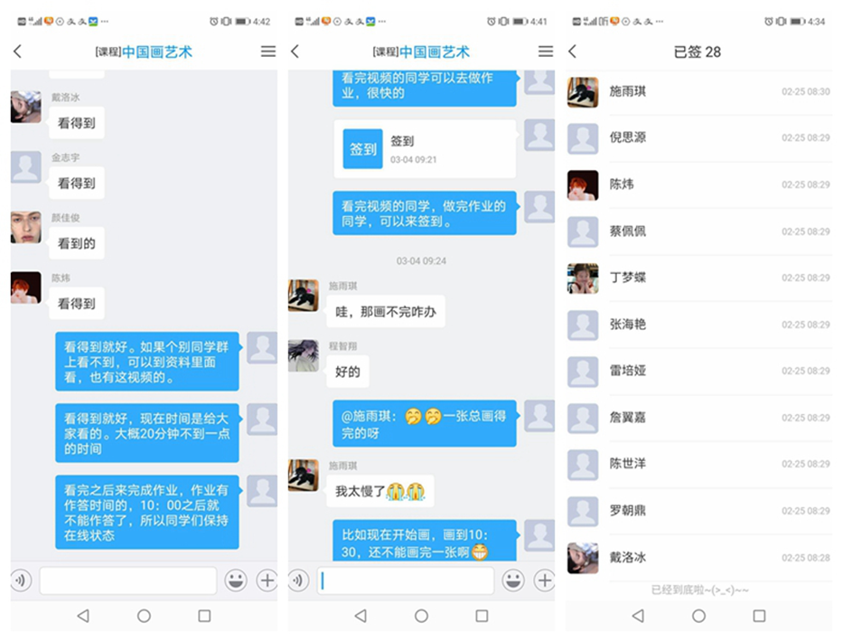 5、“管”指的是“学生管理”。线上教学最难的就是学生的管理,我们无法把控学生是否在互联网的另一端进行着课程的学习。三位老师通过签名签到、过程把控和随机连线三种方式最大程度掌控了学生的学习情况。过程把控一是指利用钉钉平台发起全班视频会议,学生的学习状态一目了然;二是可以发布课堂内的定时作业以检测学生是否在做作业。随机连线是指通过视频连线把同学请入课堂的方式检验学生是否真正在课堂学习。