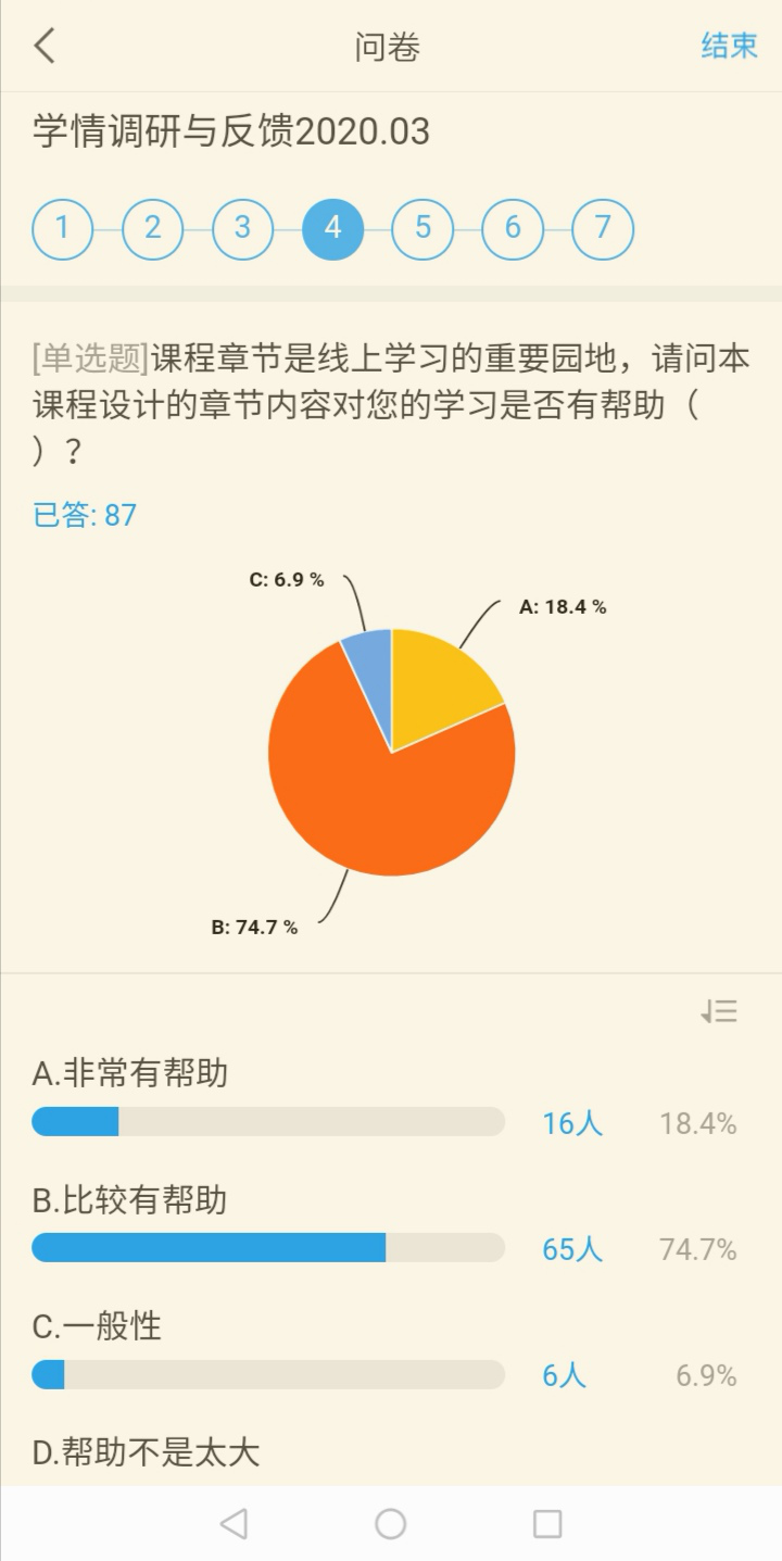 本课程通过学为中心、成果导向的课程设计,把课前预习、课后复习,与课程直播有机地结合起来的网络教学方式,能够为学生提供全方位的学习支持和学习激励。同时,借助学习通APP经常性地开展问卷调查,征询学生的教学意见,持续改进课程的教学设计。