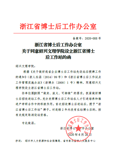 近日,经绍兴市人力资源和社会保障局考察论证、浙江省博士后工作办公室批准,同意我校设立浙江省博士后科研工作站。