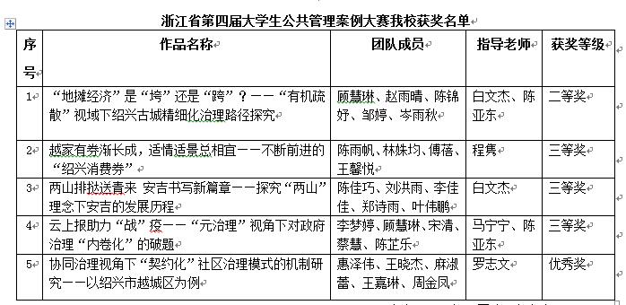 12月18日至19日,浙江省第四届大学生公共管理案例大赛决赛在浙江工业大学朝晖校区举行。经过激烈的角逐,我校共有5支队伍进入省赛,荣获二等奖1项、三等奖3项、优秀奖1项。