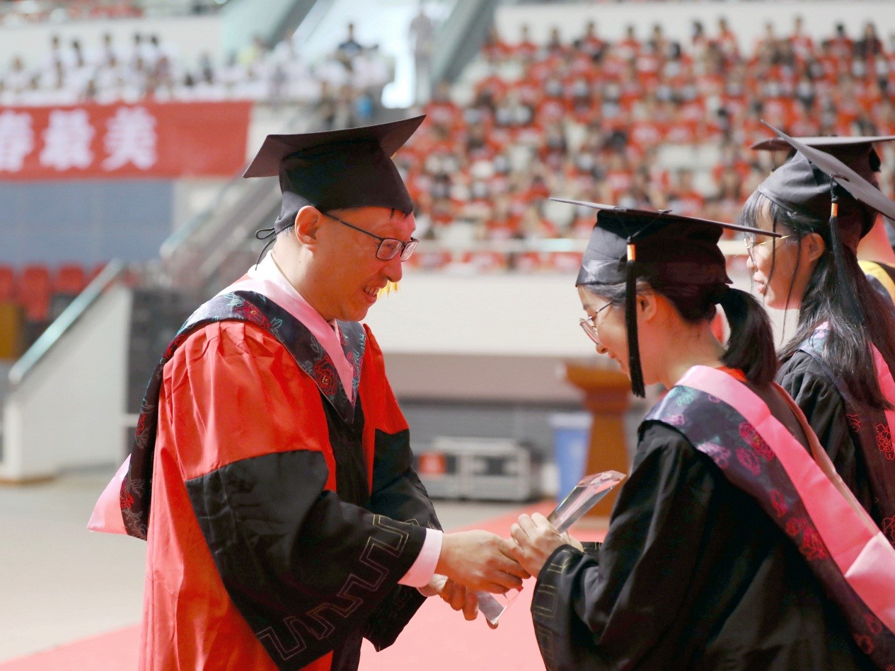 6月15-16日,在河西体育馆内,校长王建力身着导师服,和2021届毕业生一一握手,为他们拨穗。把“穗”从右边拨到左边只需要短短几秒,却承载了同学们四年的辛勤努力,代表着他们顺利完成学业。