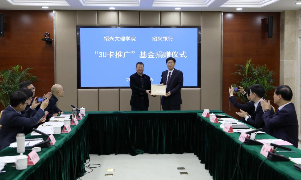 10月26日上午,校“3U卡推广”基金捐赠仪式在铁成科教馆一楼小会议室举行。校党委副书记沈赤,绍兴银行董事长金建康、行长陈军、副行长吴维杠,绍兴文旅集团游客中心主任沈仲茂,学校对外联络处、党委宣传部、教务处、计财处、后勤管理处和人文学院相关负责人等参加会议。