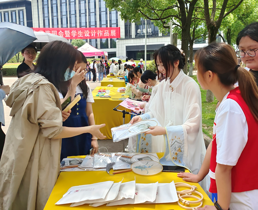 中午,志廉楼草坪旁边,一群身着汉服的女生正在现场展示刺绣技艺,她们正在展示的是《手工刺绣》课程的作业。现场还设置了刺绣DIY体验区,参与者可购买一个刺绣体验包,体验包的所得收入将全部捐入纺织服装学院爱心公益平台“壹诺公益”。此外还可以获得一张爱心券和壹诺基公益logo钥匙扣。