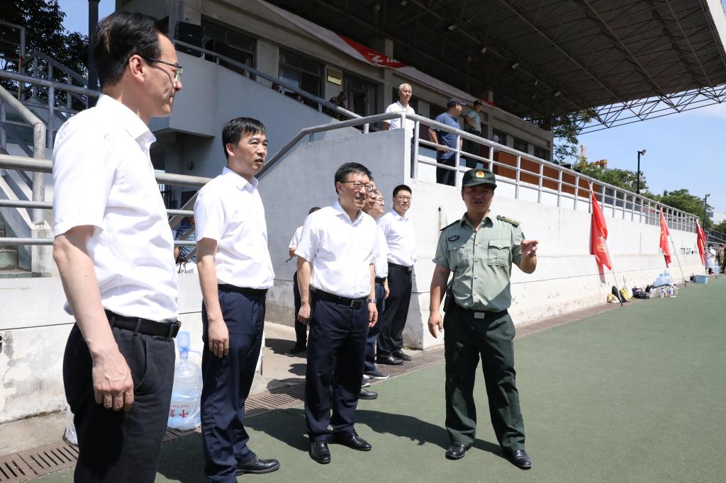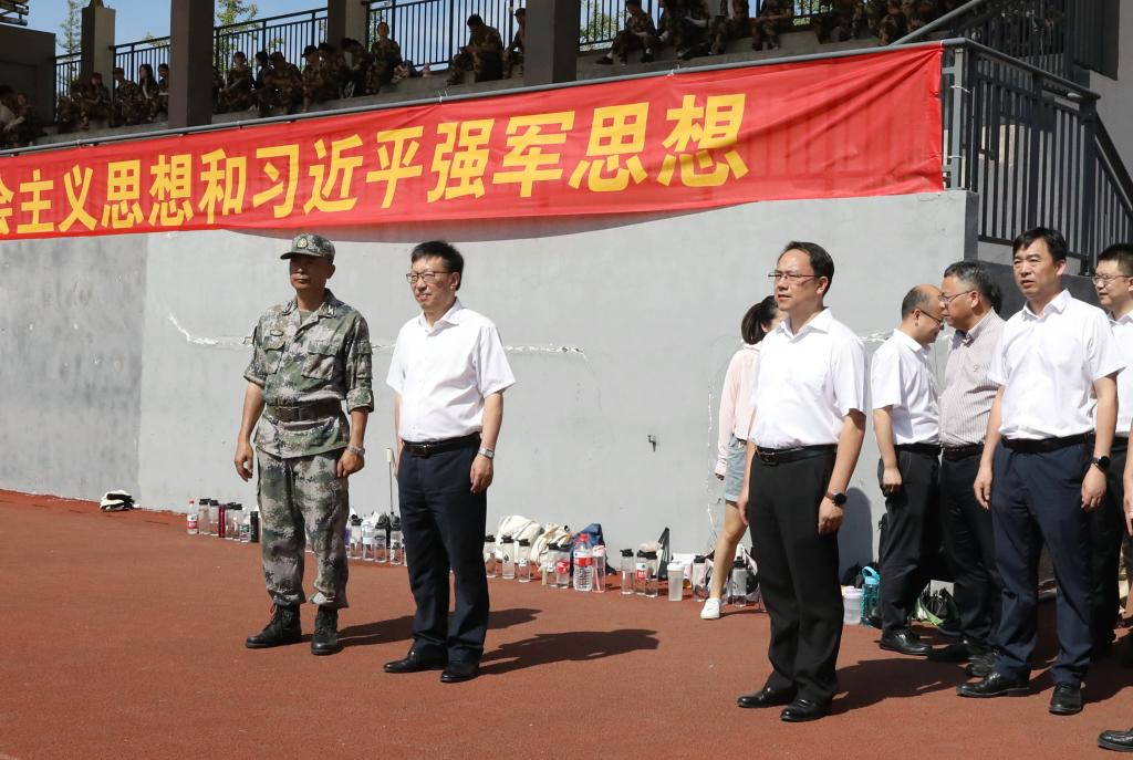 汪俊昌一行详细了解训练情况并在现场观看了训练,听取承训教官关于军训情况的报告。他对同学们在烈日炎炎下坚持训练、不怕苦不怕累的精神给予充分肯定,对承训教官的辛勤付出表示诚挚感谢。他希望同学们通过军训磨练意志品质,提高身体素质,以高质量、严标准完成军训任务,以更饱满的精神面貌投入学习和生活。