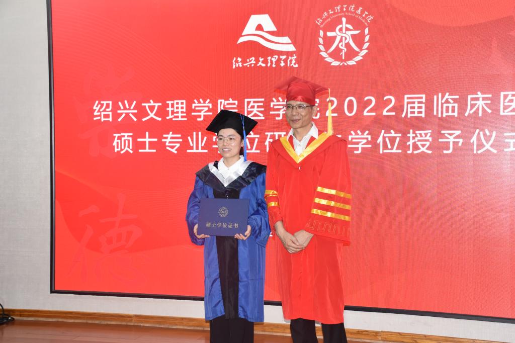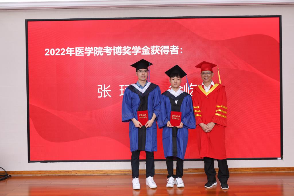 研究生处处长令狐文生为获得2022届绍兴市普通高等学校优秀毕业生颁奖,医学院党委副书记金坚强主持典礼,常务副院长葛建荣宣读考博奖学金表彰文件,副院长邢海燕宣读学位授予文件。
