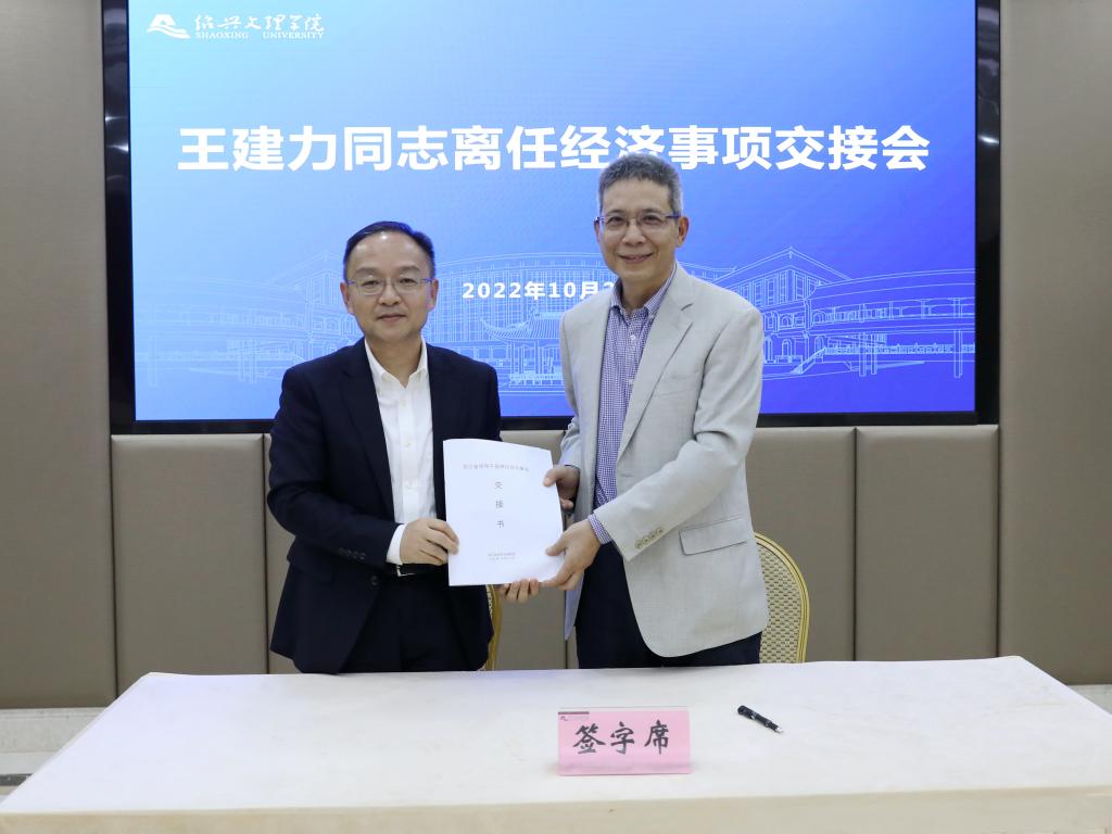 王建力和赵阳共同签署了《浙江省领导干部离任经济事项交接书》。副校长黄坚、市委组织部和审计局相关部门负责人分别代表校方和监交单位在交接书上签字。