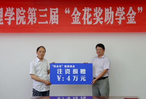 6月2日下午,我校第三届“金花奖助学金”颁奖典礼在行政楼五楼会议室举行。李马鑫先生与其弟弟李兴友先生专程来到学校,亲自为第三届金花奖助学金获得者颁奖,并兑现之前的承诺,再次向陆金花慈善基金注入4万元,目前基金总数已达113万。