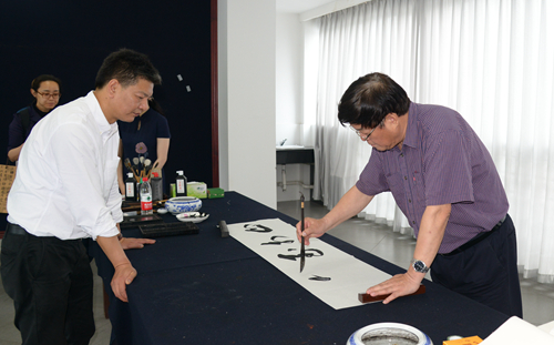 修福金对学校近年来各项事业的发展表示了高度肯定,对兰亭书法艺术学院在人才培养方面取得的成绩充分认可。在实地参观兰亭书法艺术学院校园后,他对学院幽静怡人的校园环境和浓厚的书法艺术氛围连连称赞。在学院展厅,修福金一行认真参观了2012级学生毕业作品展,在为毕业生的书法水平点赞的同时,也饶有兴致地挥毫拨墨,写下“止于至善”四个大字。