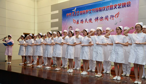 授帽仪式结束后,还举行了“医路天使 与你同行”主题晚会。手语表演《感恩的心》、独舞《采薇》、合唱《THE ROSE》、朗诵《相信未来》、团扇舞《茉莉花》、合唱《中国护士之歌》等所有节目都由医学院师生编导、参演,载歌载舞,表达了护生们奉献爱、守护爱、传递爱的职责和决心。