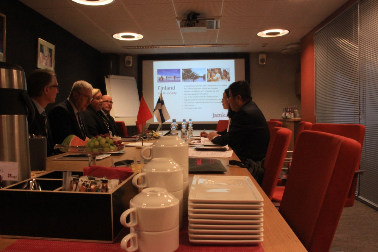 在JAMK访问时,Heikki Malinen先生首先向代表团介绍了该大学办学的基本情况,并请该大学教育教学质量管理部主任和研究发展与革新服务部主任介绍了相关情况,由国际处处长重点介绍了该校各类国际化项目。邱卫东表示两校在教师教育、护理专业、音乐及生命科学等方面的合作既符合教育国际化的大趋势,也是我校的愿望。他指出,近几年通过借鉴JAMK的优质教育资源,我校相关学科的国际化意识与能力有了极大的提高。他希望能继续推进两校在师生交流方面的合作项目,在积极创造条件申报护理专业中外合作办学项目的同时,探讨在环境保护专业和学科之间的合作可能性。