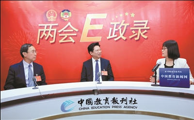 3月9日,胡卫(中)、叶飞帆(左)做客中国教育报刊社“两会E政录”演播室。