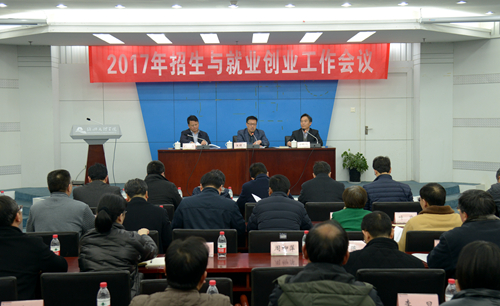 3月16日下午,学校在图书馆一楼报告厅召开2017年招生与就业创业工作会议。校党委书记汪俊昌,党委副书记唐和祥、沈赤出席会议,相关职能部门负责人、各学院院长、学生工作副书记、专业主任参加会议。