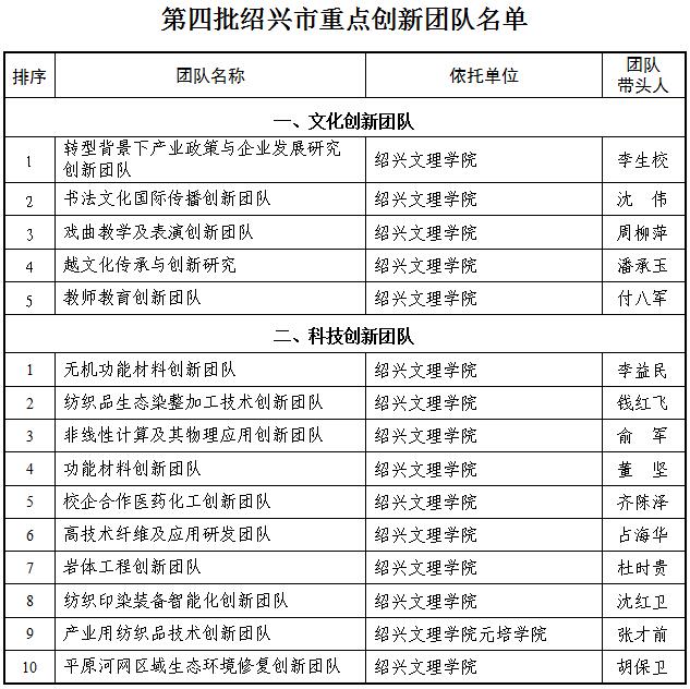 1月6日,绍兴市委人才工作领导小组下发《关于公布第四批绍兴市重点创新团队和考核优秀重点创新团队的通知》(绍市委人领〔2017〕2号)文件,我校15个团队通过评审成为第四批“绍兴市重点创新团队”,其中5个文化创新团队、10个科技创新团队。另外,5个创新团队被确定为“考核优秀重点创新团队”。详情如下: