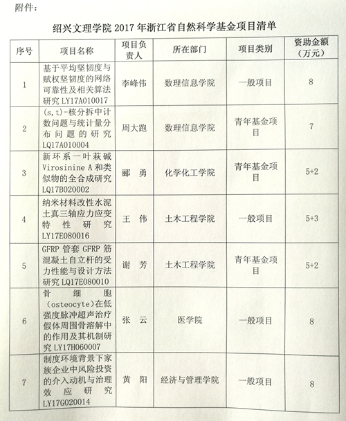 日前,浙江省自然科学基金委员会办公室公布了2017年省自然科学基金项目,我校获批7项。具体项目请见附件。