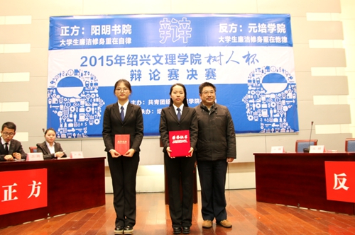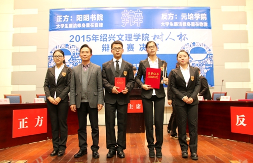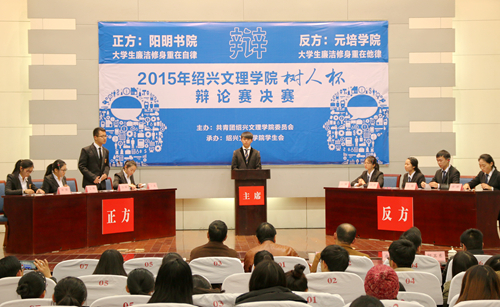 经过两个月的激烈角逐,12月15日,我校2015年“树人杯”辩论赛决赛在铁城科教馆举行。本次辩论赛首次以书院代表队作为参赛单位进行,从全校10支辩论队中脱颖而出的阳明书院代表队和元培学院代表队,围绕“大学生廉洁修身重在自律还是他律”展开了激烈论辩。最终阳明书院代表队夺冠,元培学院代表队获亚军。