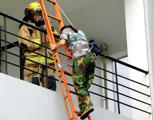 9月6日中午1点,南山阳明书院2号楼2楼楼道忽然浓烟滚滚,一名学生迅速向校园110报警,监控中心迅速拨打消防“119”、急救“120”。随着几声尖利急促的哨声响起,同学们纷纷以湿毛巾掩鼻,迅速而有序地从紧急出口向楼下疏散。几分钟的时间里,各楼层的学生陆续安全转移到楼下广场上。这时,2楼的1名女生挥舞着毛巾大声呼喊“救命”,消防官兵迅速架起消防梯,将受困女生安全救下,同时其他消防官兵连接好水带,扑灭火源。这是我校举行的消防安全宣传教育“进军训”疏散演练活动。