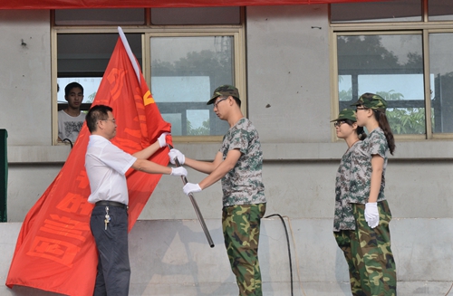 副校长寿永明向军训团授旗,标志着2014级学生集中军事训练正式开始。