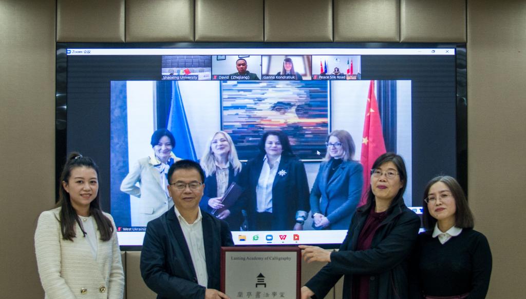 11月3日下午,我校与乌克兰西部国立大学以视频会议的方式签署两校海外“兰亭书法学堂”项目合作协议并授牌。乌克兰西部国立大学副校长Oksana Desyatnyuk、外国语及信息交流中心主任Lyudmyla Kraynyak、国际交流中心主任Olga Tsaryk、我校副校长寿永明等出席签约及授牌仪式。