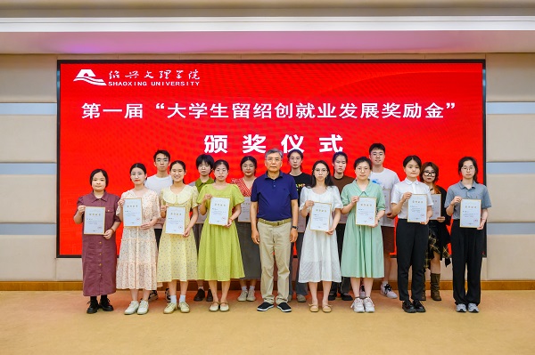 严建国为第一届“大学生留绍创就业发展奖励金”获奖学生代表颁奖