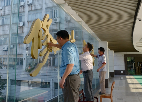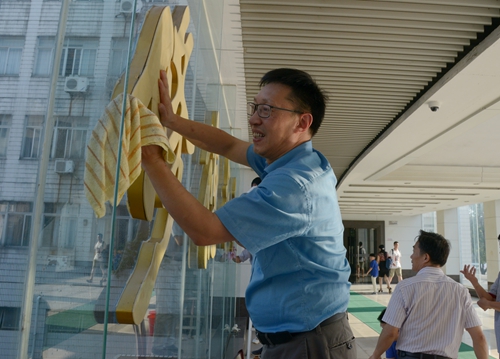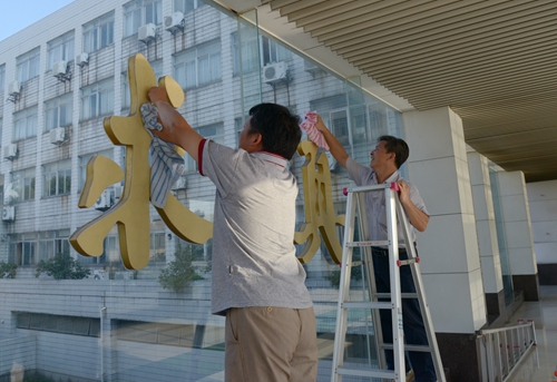 花坛清理完后,校领导到行政楼大厅擦洗玻璃。校领导拿着抹布,一丝不苟、认真细致地擦洗“修德求真”四个大字和行政楼大厅玻璃。经过一个小时多的“奋战”,花坛的杂草被清理得干干净净,“修德求真”四个大字擦洗的熠熠生辉。