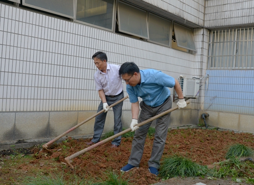在行政楼中间的花坛上,校领导拿着锄头、铁锹,对花坛上的杂草进行大清除,并翻松土地,准备种植绿植。校领导热情高涨,干劲十足,不怕脏、不怕累、不怕苦,干得热火朝天,汗流浃背。