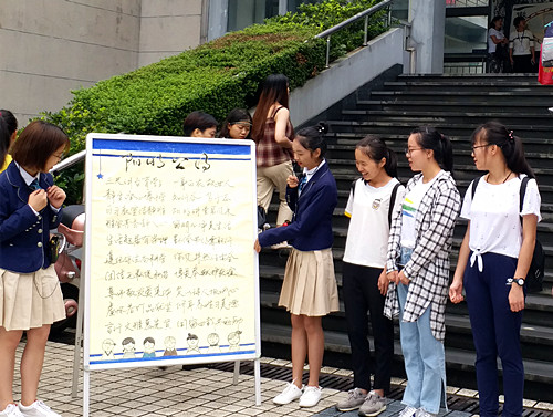 在迎新的各站点,迎新创意层出不穷。文澜书院的合影板、阳明书院的倡议书、建功书院的心愿墙等向新生表达美好祝愿,鼓励新生规划大学生活、认真对待每一天;仲申书院布置了可爱的创意语言板让“萌新们”感受到书院的温暖,还为每一位学生佩戴了书院徽章,这些具有书院标志特色的纪念品则成为了“书院人”的专属品;成章书院为新生和家长免费提供了姜茶和热水,为来自五湖四海的2017级新生们送上“新”家的温暖。