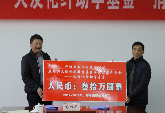 12月13日下午,“大发化纤助学基金”捐赠仪式在行政楼五楼会议室举行。宁波大发化纤有限公司副总经理、数学80届钱军校友与校党委副书记沈赤签订捐赠协议。沈赤接受捐赠并向钱军校友颁发捐赠证书。钱军校友代表宁波大发化纤有限公司向学校基金会捐赠30万元设立“大发化纤助学基金”。校友总会会长宋培基,对外联络处、学工部、化学化工学院负责人和师生代表参加捐赠仪式。