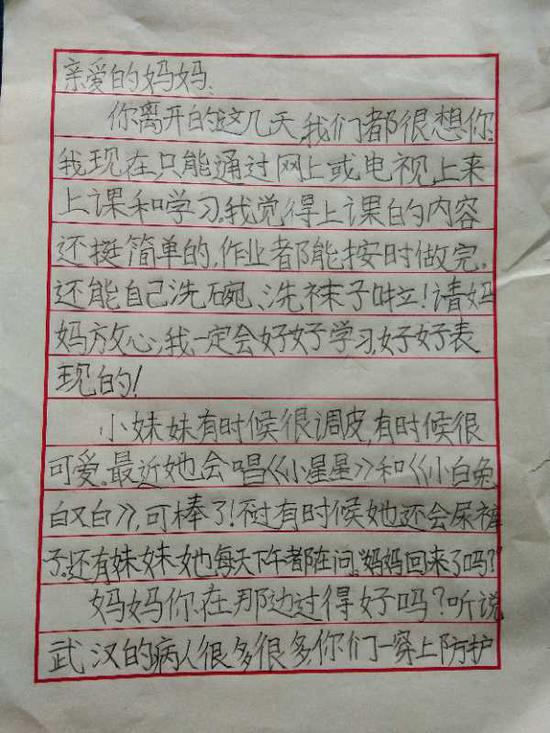 坚守绍兴本地医院抗疫多日后,2月9日,丁红艳作为绍兴市第三批驰援武汉医疗队一员出征武汉,至今已有16天。懂事的儿子在信里向妈妈汇报自己和妹妹的情况,让妈妈放心,也期盼她早日平安回家。