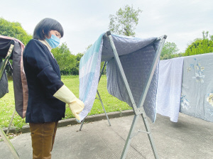 记者在现场看到,负责晒被子的宿管阿姨都戴着口罩和手套,且身着工作制服,“公司有统一的服务规范,大家都提前接受了培训。”严凤娟说,根据公司安排和“订单”需求,这些天,每位宿管阿姨预计要晾晒100多床被子。