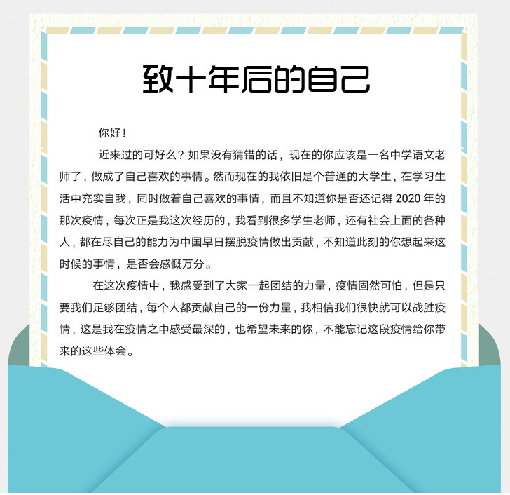 “徐欣玫,现在的你已经31周岁了,与从前相比,真的长大不少,尤其从新冠肺炎疫情时期走来......”在心理健康室的信箱里,一封封《致十年后的自己》满载着同学们对未来的期许。同学们以写一封信给十年后的“我”的方式,写下经历疫情的自己是如何为学习和生活而努力的点滴感悟。
