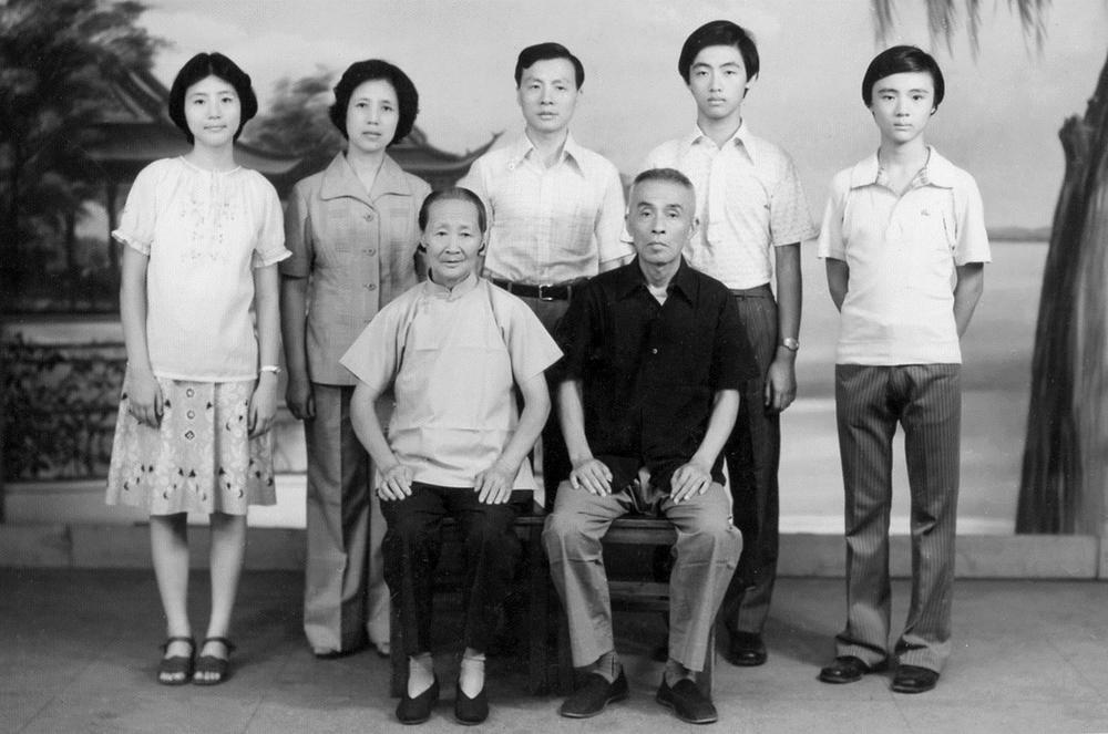 1978年车越乔夫妇携子女来绍兴探望父母车恂如夫妇时拍摄的全家福(前一排为车恂如夫妇,第二排左二、左三车越乔夫妇,左一长女车文蔚、左四为长子车弘刚、左五为次子车弘健) 资料图片由受访者提供