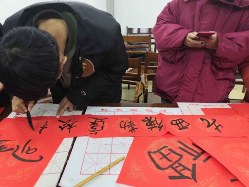 藏语传情送祝福。党支部邀请了西藏的同学们参加本次活动,他们用藏语写下了新年的祝福“扎西德勒蓬松措”。藏语美得不可方物,一撇一捺之间,尽显民族之间的和气。党员同志都跃跃欲试,请西藏的同学传授藏语中“福”字书写的方式。