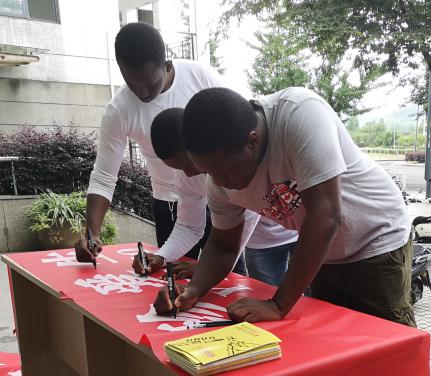 6月26日,国际教育学院开展了以“珍爱生命、远离毒品”为主题的系列活动。活动当日,国际教育学院教师和学生干部向国际学生发放禁毒宣传手册,告诫学生不吸毒,不贩毒,自觉抵制毒品。在场的每位国际学生都在禁毒宣传横幅上签下自己的名字,并签订《禁毒承诺书》,以表达自己防毒、拒毒和宣传禁毒知识的决心。
