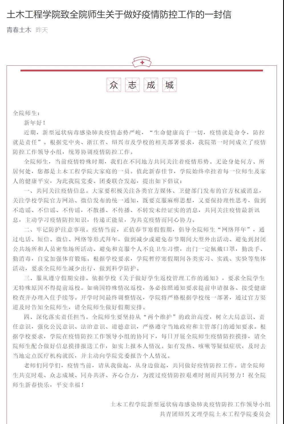 当下,全国新型冠状病毒感染肺炎疫情态势严峻。党中央高度重视,习近平总书记发出“生命高于一切,疫情就是命令,防控就是责任”的有力号召。土木工程学院第一时间成立了疫情防控工作领导小组,统筹协调疫情防控工作,积极响应绍兴市委组织部发出《关于充分发挥全市党组织和广大党员干部在新型冠状病毒感染肺炎疫情防控中的战斗堡垒作用和先锋模范作用的通知》要求,动员全院师生、党员干部迅速行动,为抗击疫情、支援武汉贡献力量。