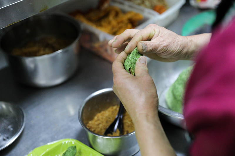 艾饺是用新鲜的艾草和糯米粉按比例混合制作,需经好几道工序。首先要将艾叶清洗干净,放入碱水一起煮,待艾叶煮透,煮出浓绿的汁水,便将滚烫的艾叶和汁水倒入混合好的粳米粉和糯米粉中搅拌,然后趁热揉粉。“包艾饺,面团的柔韧性可是关键,”餐厅面点师傅介绍说:“和面的过程中得用糯米粉掺粳米粉,然后把捣烂的艾草放进去,加适量热水,搅拌均匀后,使劲地搓捏,直到有韧性为止才好。” 最后用旺火隔水蒸10分钟后,软绵绵、香喷喷的艾饺就做好了。
