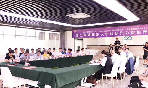 5月28日下午,元培学院哈工海渡机器人学院绍兴分院揭牌仪式在腾讯云互联网学院·智创空间路演厅(香农)举行。、副院长李黎,江苏哈工海渡教育科技集团董事兼副总经理尹政、校企合作经理俞士熔、上海发那科机器人公共教育科科长、发那科技术学院副院长封佳诚,公共教育科销售经理袁静云出席仪式。教务处、招生就业处负责人、信息与机电工程分院党政领导班子成员、教师代表及机械类优秀学生代表参加仪式。