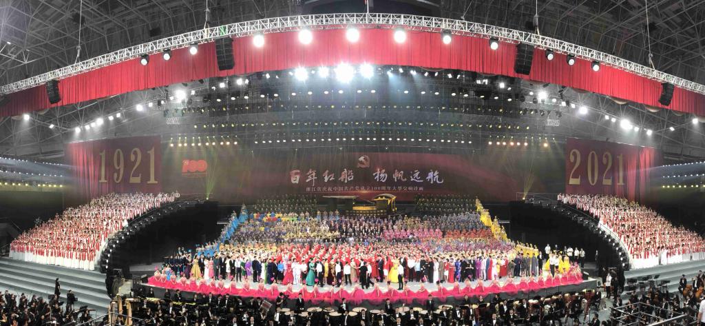6月27日晚,浙江省庆祝中国共产党成立100周年大型交响诗画文艺演出《百年红船扬帆远航》在黄龙体育中心体育馆上演,以艺术的形式回顾党的奋斗历程、讴歌党的光辉业绩、祝福党的百年华诞。演出由省委宣传部、省文化和旅游厅、浙江广播电视集团主办,浙江音乐学院和浙江演艺集团、浙江省黄龙体育中心承办。