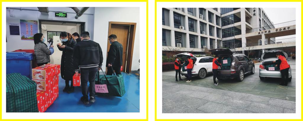 同时,资产经营公司商贸中心接到上门派送防疫爱心包的任务,克服了时间紧、任务重、人手紧的困难,在公司党员志愿者和员工们共同努力,跨校区、爬楼梯,一个单位一个部门,点对点送到值班人员的手上,顺利完成了各行政部门及二级学院的防疫值班爱心包的派送服务工作。