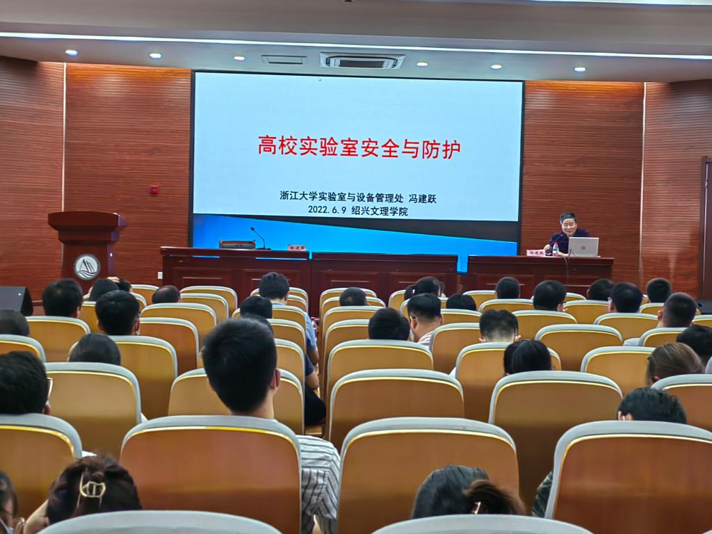 为进一步贯彻落实全国高等学校实验室安全工作会议精神,深化实验室安全三级联动管理,提高实验室安全防护与应急能力,杜绝实验室安全责任事故发生,保障师生生命财产安全,6月9日下午,学校特邀浙江大学原实验室与设备管理处处长冯建跃研究员作题为《高校实验室安全与防护》的专题讲座。资产与实验室管理处、保卫处、研究生处、教务处等相关职能部门负责人,各学院实验室安全分管领导、建制实验室主任、科研平台负责人及实验技术人员、研究生代表等共130余人参加讲座。会议由资产与设备管理处副处长(主持工作)陈建军主持。