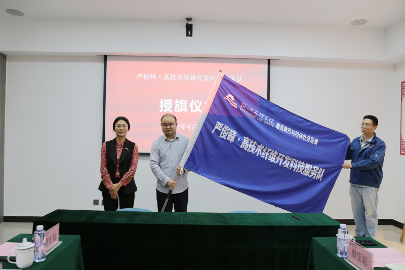 赵浪平为“严俊峰·高技术纤维开发科技服务队”授旗。