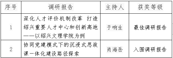 近日,中共绍兴市委组织部公布2022年度绍兴市党建研究和组织系统优秀调研成果,学校2篇调研报告获奖,其中全市党建研究优秀调研成果最佳调研报告1篇、入围调研报告1篇。